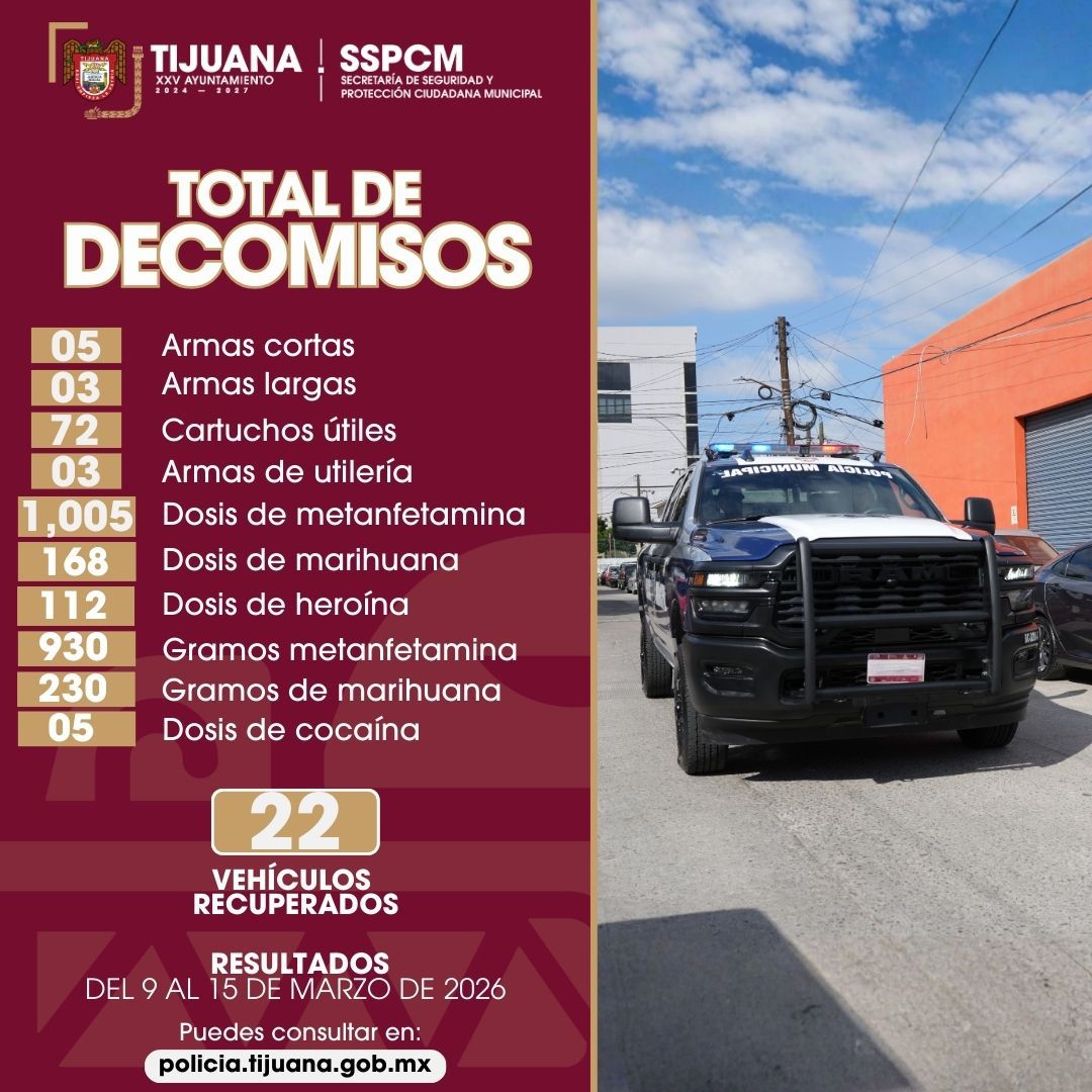 El reporte semanal coloca a los decomisos en Tijuana como uno de los principales resultados de la estrategia de vigilancia municipal. En el mismo periodo, la corporación también informó la recuperación de 22 vehículos que contaban con denuncia o predenuncia de robo, los cuales quedaron asegurados para su posterior devolución a sus propietarios.